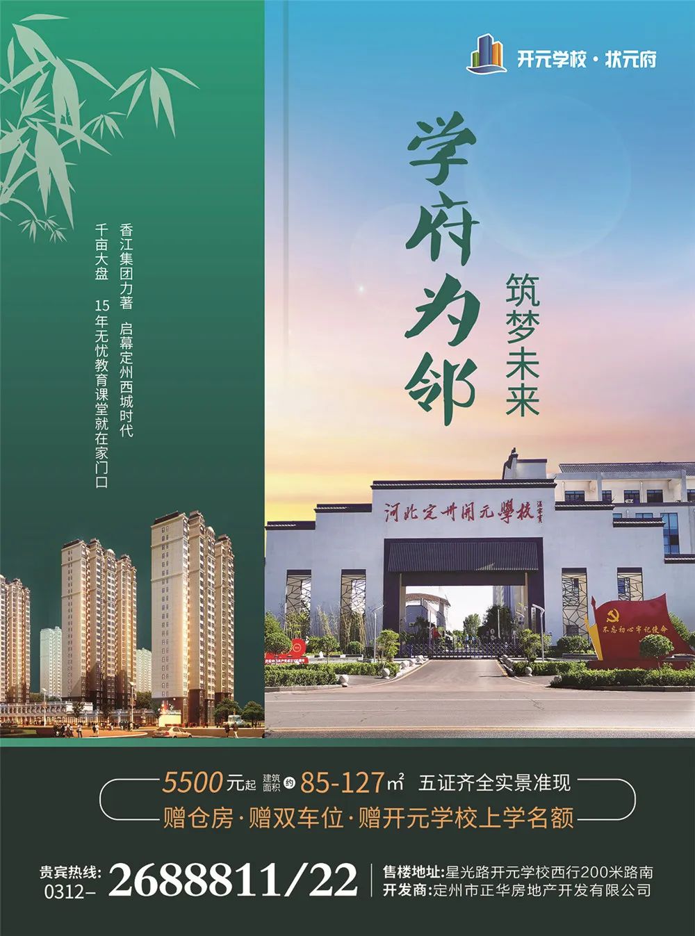 状元府千亩大盘,所售均五证齐全,封顶准现,即买即办网签,受政府监管;5500元/平起,赠仓房,赠双车位,赠开元学校上学名额。