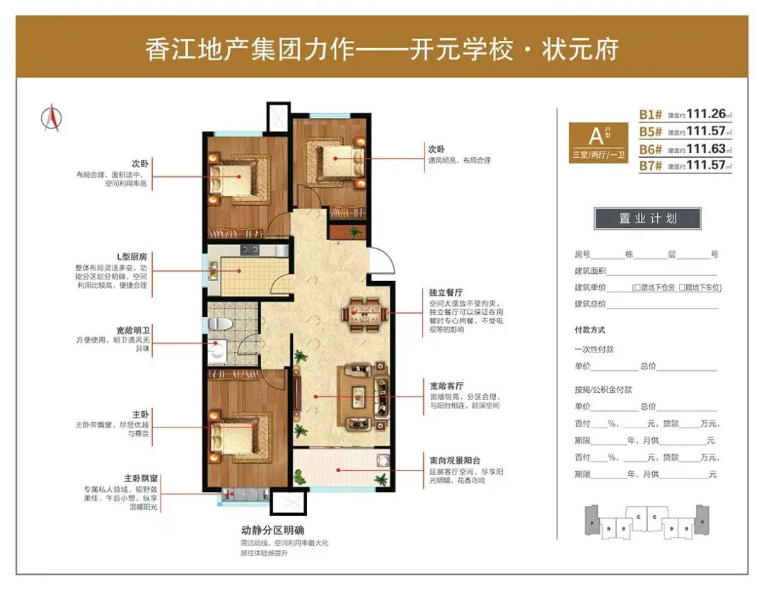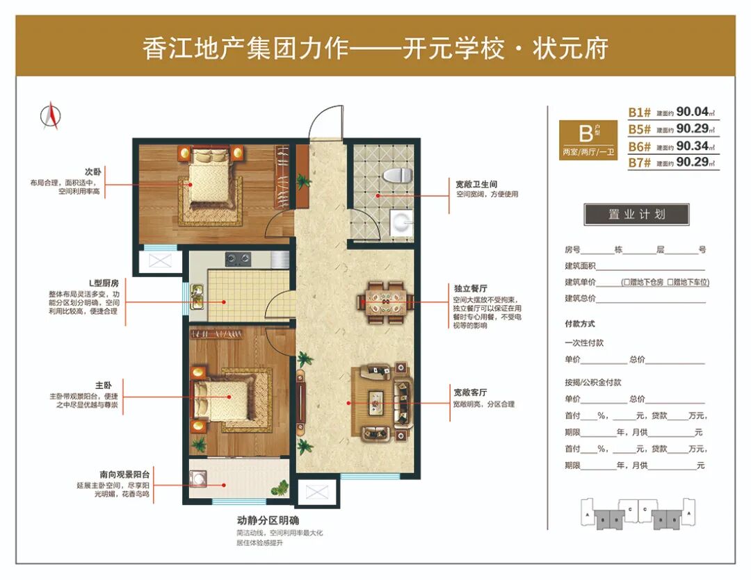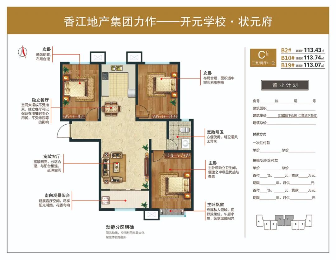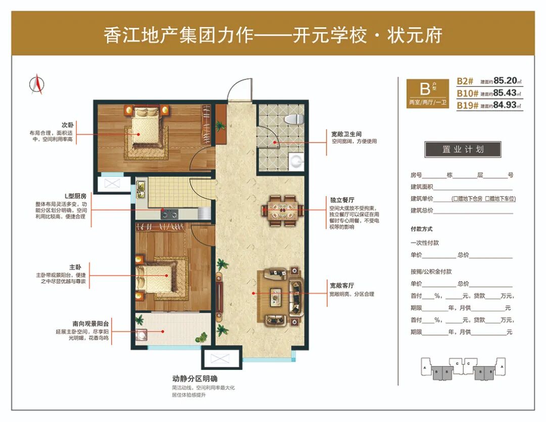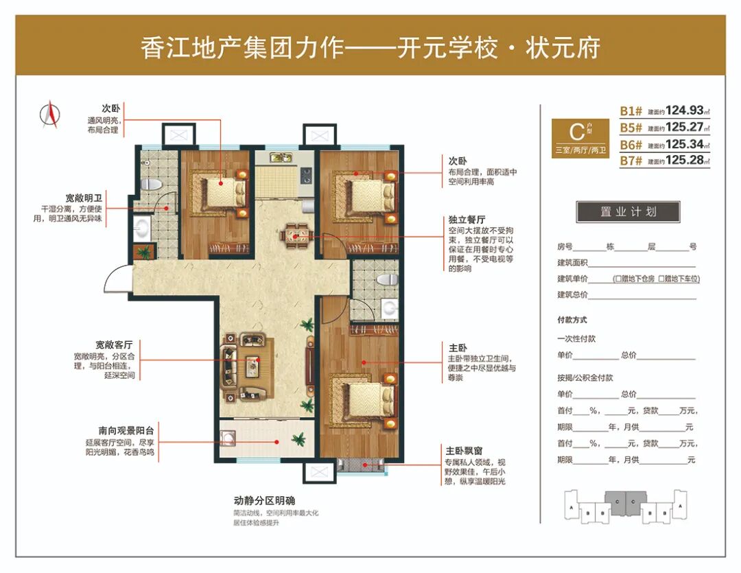 开元状元府户型面积约85—130㎡,经典户型、通透舒适!轩逸宽厅、奢适卧房、明亮餐厨、干湿分离、宽境阳台、观景飘窗。从新婚二人世界到三代同堂,满足你的各种需求。