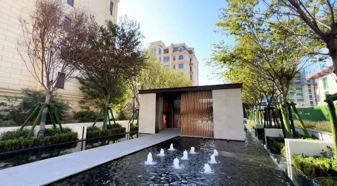 朴色的廊架在通透的绿意间隐现,质朴自然,岁月静好,梦回对酒抚琴的宁静典雅。暗香水景萦绕,投石问水,淙淙仿若天籁,掬水成握,清香四伏。